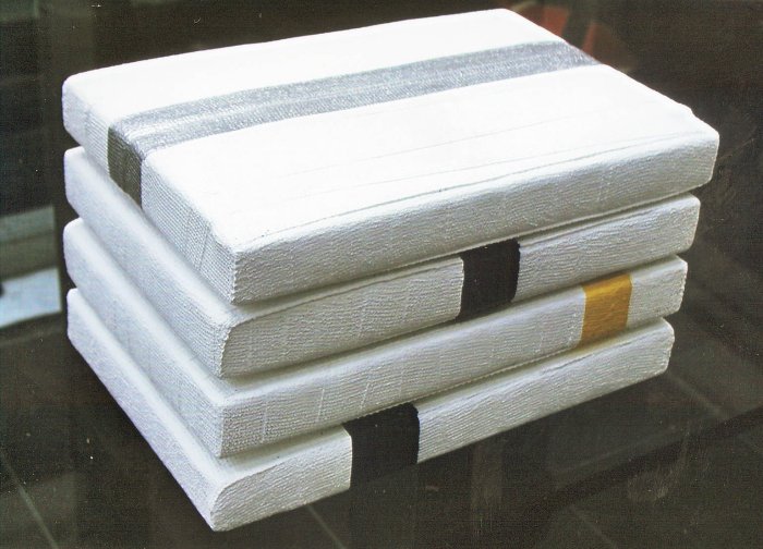 Skulptur aus Schachteln mit Scotchcast eingepackt und Dekalack bemalt, 17 x 29 x 19 cm